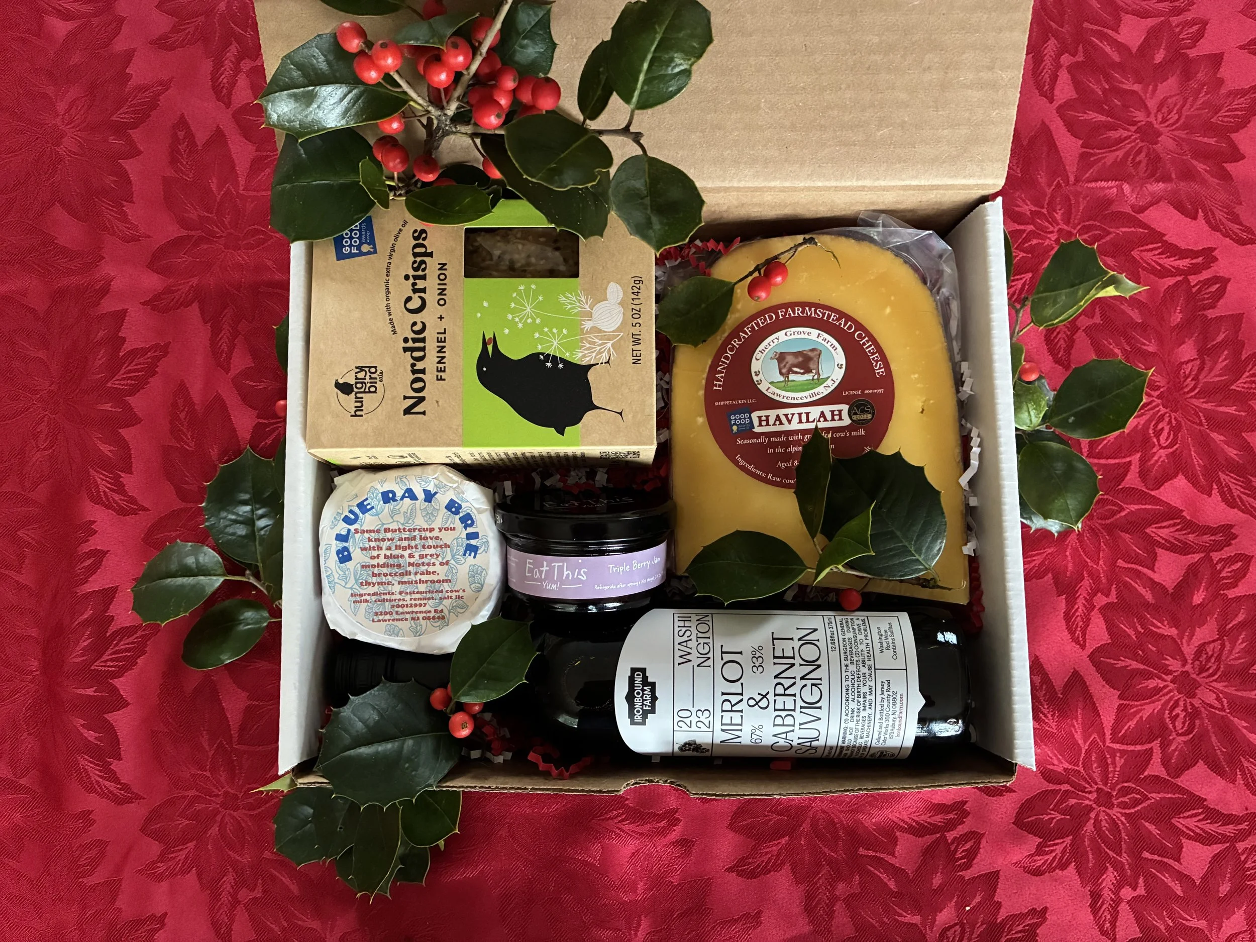 We have a wide variety of gift baskets which feature our farmstead cheese with some accompaniments. If you want a small one, have a look at the Amuse Bouche and if you want a large one, check out the Whole Herd or the Jersey. You can order these on line and we will deliver, or you can pick up in the store. Most fun of all is if you come into the store and make up your own gift box or basket, with the items of your choice. Some nice additions are Ironbound wine or cider; okra pickles, mango puree, a hand made cheese board or some alpaca socks!
